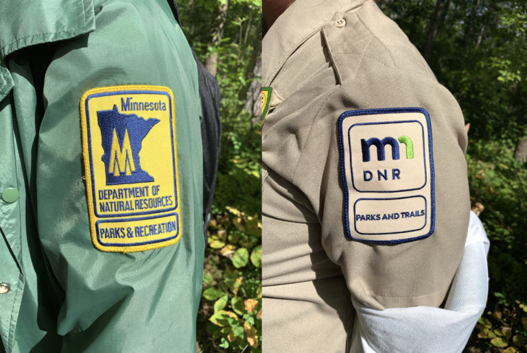 All Minnesota state agencies, boards, and commissions in the executive branch moved to the new Minnesota state brand in December 2017. Here this change is evidenced by two overlayed patches, on a shirt and outer jacket worn by Connie Cox, Lake Itasca's lead naturalist.