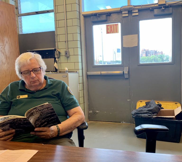 Mississippi Park Ranger, Sandy Fuller enjoys a quiet moment with the FS1 booklet in the St Anthony Falls Lock and Dam visitor centre control room.