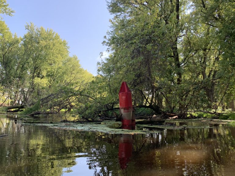 Red buoys, called “nuns,” and green buoys, called “cans,” serve as navigational markers along the river. They demarcate the edges of the 9-foot channel for barge traffic. This nun went rogue and escaped somehow into the backwaters near Richmond Island, likely carried off by flooding.