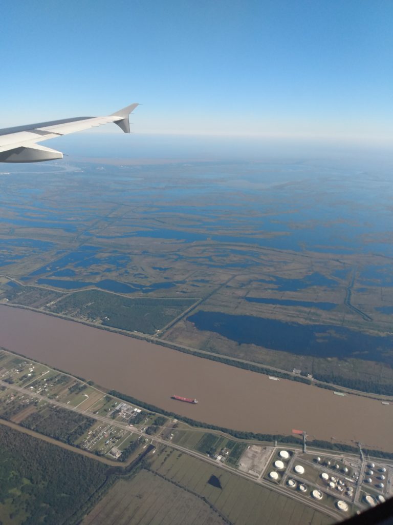 From above. Landing on human delta. Long flight from Matanza Riachuelo River, Buenos Aires